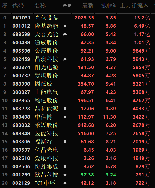 從漲幅居首的光伏設備行業(yè)看,截至10月25日11:30,該行業(yè)交易中的48只個股有45只上漲,其中15只漲幅超5%。從資金流向看,該行業(yè)上午大單資金凈流入額達13.2億元,居行業(yè)第1位。