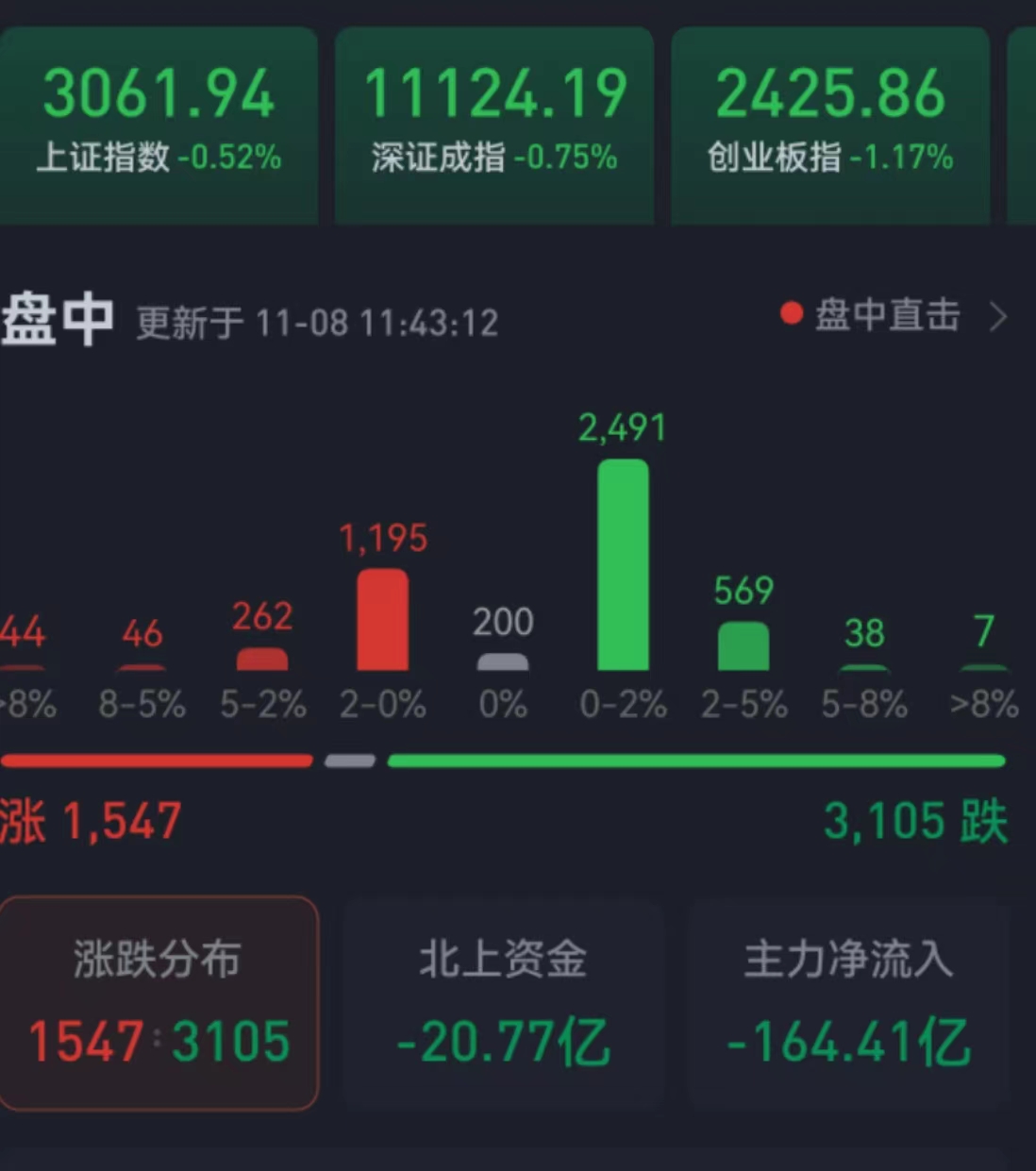 周二(11月8日),三大股指低開后震蕩走弱,全線下跌。截至上午收盤,上證指數(shù)跌幅達0.52%,報3061.94點;深證成指和創(chuàng)業(yè)板指跌幅分別為0.75%和1.17%;滬深兩市合計成交額5323.3億元,總體來看,兩市個股跌多漲少。