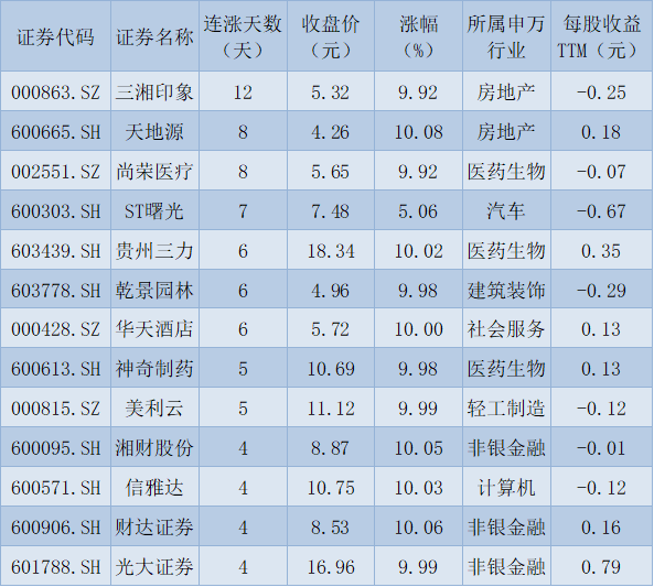 表:連續(xù)上漲4天且今日收盤(pán)漲停股一覽