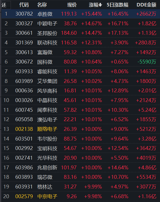 具體來(lái)看,電子行業(yè)領(lǐng)漲,獲得76.32億元大單資金的凈流入。行業(yè)中304只交易中的個(gè)股,有299只上漲,占比98.36%,其中,94只個(gè)股漲幅超5%。