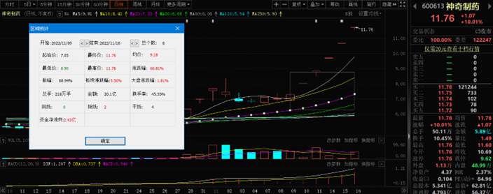11月16日,神奇制藥以11.76元封漲停板報(bào)收,漲幅達(dá)10.01%。該股自11月9日以來(lái),截至11月16日已連續(xù)6個(gè)交易日上漲,累計(jì)漲幅達(dá)66.81%,最近5個(gè)交易日均以漲停報(bào)收。該股最新A股總市值達(dá)62.81億元,A股流通市值56.37億元。