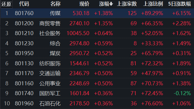 31類申萬(wàn)一級(jí)行業(yè)中,有12類上漲,其中,傳媒漲幅達(dá)1.38%,居首,商貿(mào)零售緊隨其后,也漲超1%;此外,電力設(shè)備行業(yè)跌幅居前,下跌2.07%。