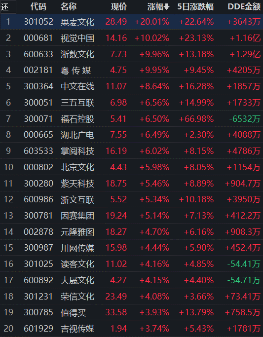 11月16日,申萬(wàn)一級(jí)行業(yè)中,傳媒行業(yè)領(lǐng)漲,漲幅達(dá)1.38%,獲得1.16億元大單資金的凈流入,居資金流入行業(yè)第4位。行業(yè)中139只交易中的個(gè)股,有125只上漲,占比89.93%,其中,13只個(gè)股漲幅超5%。