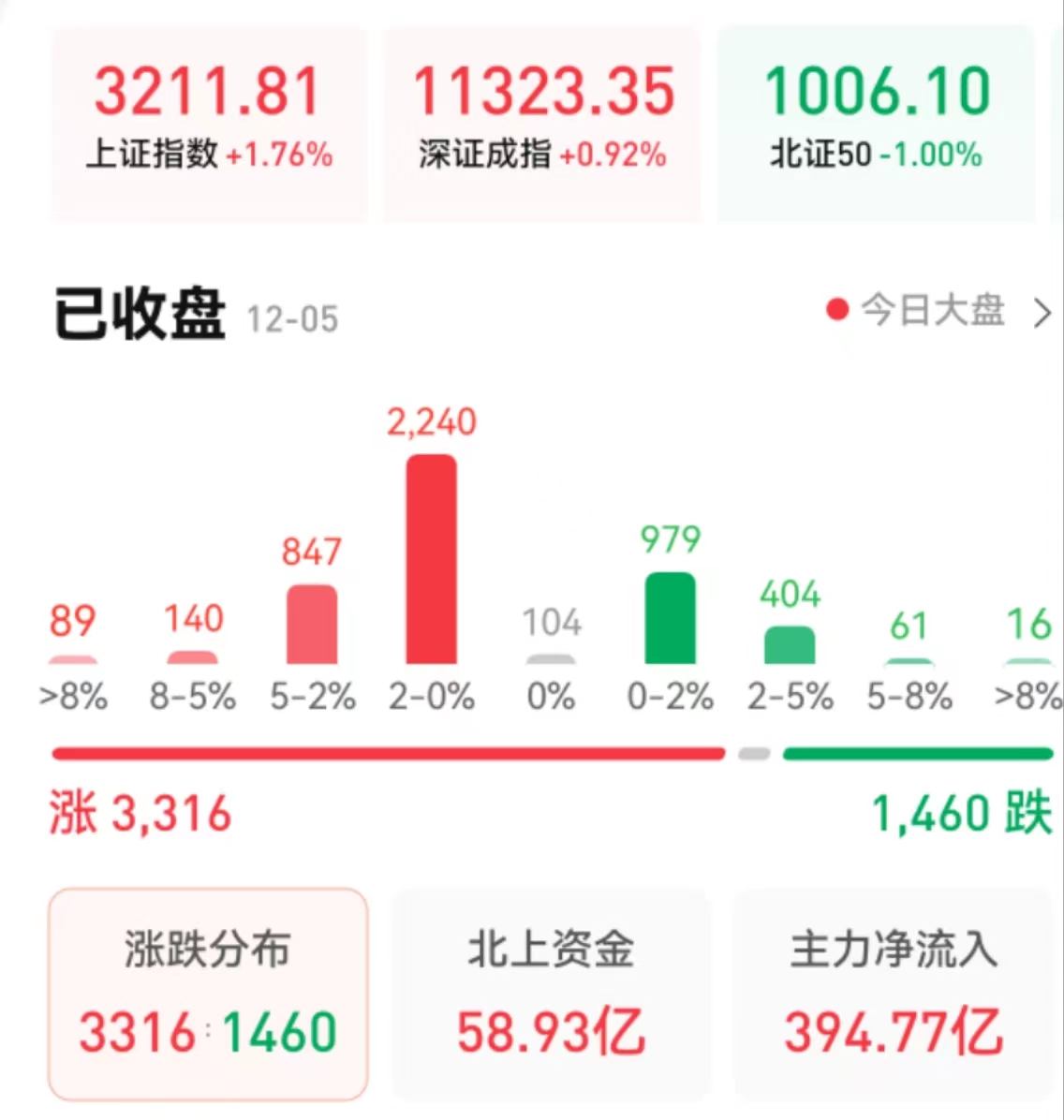 周一(12月5日),A股三大指數(shù)震蕩分化。截至收盤(pán),上證指數(shù)漲1.76%報(bào)3211.81點(diǎn),深證成指漲0.92%報(bào)11323.35點(diǎn),創(chuàng)業(yè)板指跌0.26%報(bào)2377.11點(diǎn);滬深兩市合計(jì)成交額突破萬(wàn)億元,達(dá)10551億元。北向資金凈買(mǎi)入58.93億元??傮w來(lái)看,兩市個(gè)股漲多跌少。
