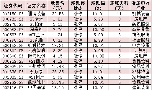 表:連續(xù)上漲4日且今日收盤(pán)漲停個(gè)股情況:
