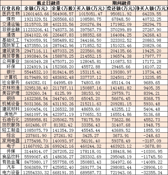 表:12月7日申萬一級行業(yè)兩融交易情況: