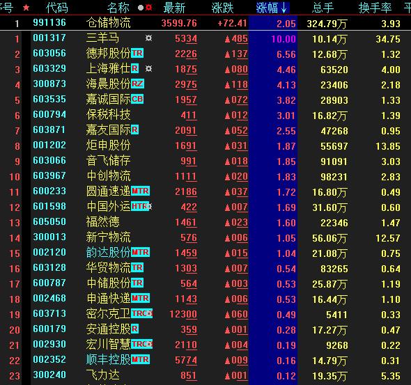 具體看,截至12月8日上午收盤,倉儲物流板塊異動拉升,漲幅居首達2.05%。其中,三羊馬漲停。