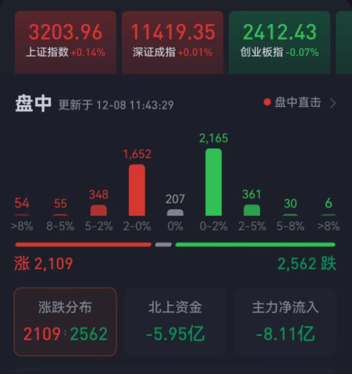 周四(12月8日),三大股指繼續(xù)震蕩分化,漲跌不一。截至上午收盤,上證指數(shù)微漲0.14%,報3203.96點,收復3200點整數(shù)關口;深證成指漲0.01%,創(chuàng)業(yè)板指跌0.07%;滬深兩市合計成交額5191.4億元,總體來看,兩市個股跌多漲少。