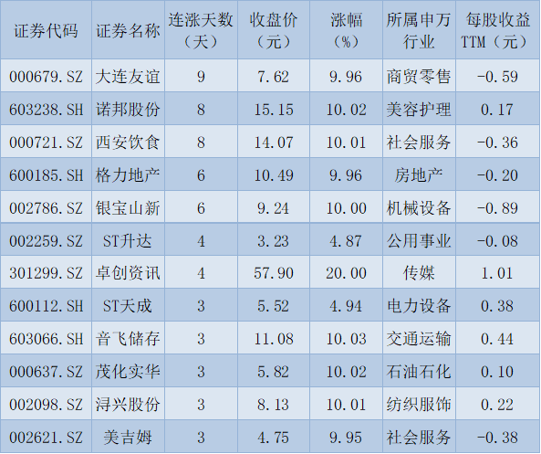 表:連續(xù)上漲3且今日收盤漲停股一覽
