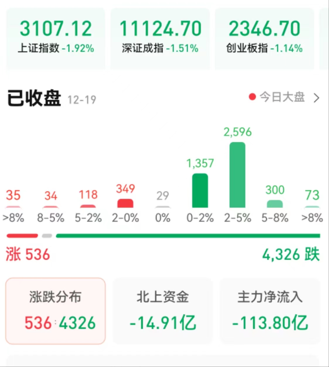 12月19日,A股三大指數(shù)震蕩回落。截至收盤,上證指數(shù)跌1.92%報(bào)3107.12點(diǎn),險(xiǎn)守3100點(diǎn);深證成指跌1.51%報(bào)11124.7點(diǎn),創(chuàng)業(yè)板指跌1.14%報(bào)2346.7點(diǎn);兩市合計(jì)成交7568億元,北向資金凈賣出14.91億元。總體上看,A股個(gè)股跌多漲少,超4000只個(gè)股下跌,其中,漲停個(gè)股達(dá)29只,跌停個(gè)股達(dá)33只。