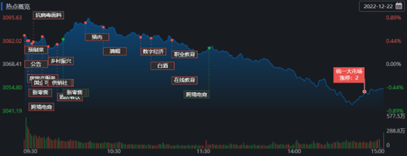 12月22日,A股三大指數(shù)高開低走,滬指開盤重回60日均線,盤中再度失守,滬指在該線已反復(fù)爭奪3個交易日。截至收盤,上證指數(shù)跌0.46%報3054.43點;深證成指跌0.33%報10876.31點,創(chuàng)業(yè)板指跌0.36%報2295.32點,A股合計成交額6579.04億元,較前一交易日增長14.65%,北向資金凈買入28.15億元??傮w上看,A股個股跌多漲少,有843只上漲,4106只下跌。