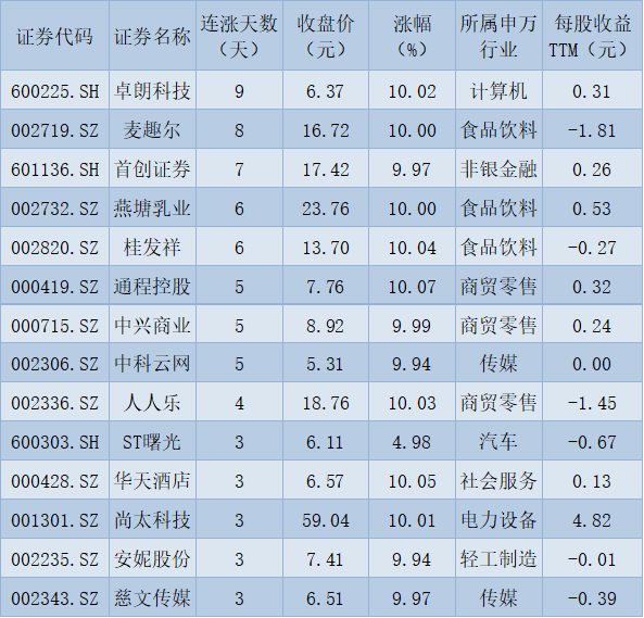 表:連續(xù)上漲3日且今日收盤漲停股一覽