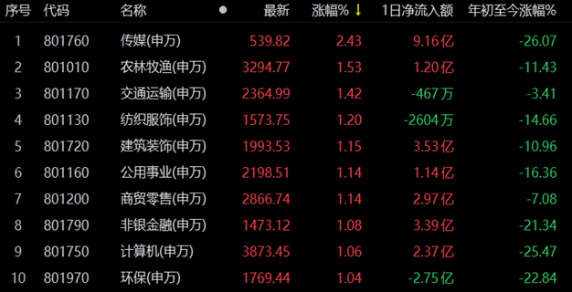 12月30日,行業(yè)板塊呈漲多跌少格局。從31類申萬一級行業(yè)看,有26類行業(yè)上漲,5類行業(yè)下跌。漲幅方面,傳媒行業(yè)居首達(dá)2.43%,農(nóng)林牧漁和交通運(yùn)輸居第二、三位。跌幅方面,有色金屬居首,跌幅達(dá)0.47%,此外,醫(yī)藥生物、電子、電力設(shè)備和鋼鐵等行業(yè)也出現(xiàn)小幅下跌。