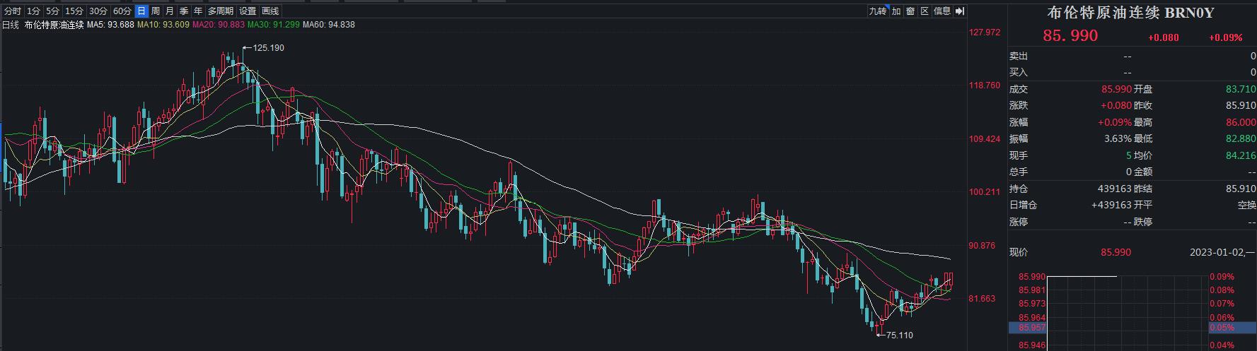 上周五,國(guó)際油價(jià)全線上漲,美油2023年2月合約漲2.69%,報(bào)80.51美元/桶,年漲7.05%。布油2023年3月合約漲3.03%,報(bào)85.99美元/桶,年漲10.56%。