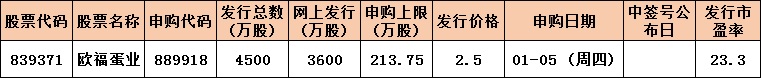 根據(jù)發(fā)行安排,本周(2023年1月3日-6日)有1只新股發(fā)行,周四安排1只,歐福蛋業(yè)。
