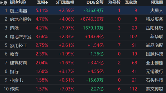 從早盤表現(xiàn)強勢的廚衛(wèi)電器行業(yè)看,交易中的9只成份股全線上漲,其中4只漲幅超5%。資金流向看,廚衛(wèi)電器行業(yè)大單資金凈流入額為-336.69萬元,居行業(yè)第28位,排名第一的房地產(chǎn)開發(fā)行業(yè),大單資金凈流入額為14.69億元。