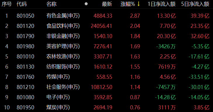 從概念板塊來看,基本金屬板塊領漲,漲幅達2.98%,雞肉概念、黃金概念、汽車一體化壓鑄、托育服務、職業(yè)教育等板塊表現強勢漲幅均超2%;6G概念領跌,跌幅達1.28%。