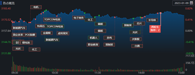 1月9日,A股三大指數高開震蕩,滬指連續(xù)6個交易日上漲,5日均線已上穿有牛熊分水嶺之稱的120日均線,技術面更趨強勢。截至收盤,上證指數漲0.58%報3176.08點;深證成指漲0.73%報11450.15點,創(chuàng)業(yè)板指漲0.75%報2440.374點,A股合計成交額8071.65億元,較前一交易日縮減3.69%,北向資金凈買入77.00億元。總體上看,A股個股漲少跌多,有2969只上漲,1786只下跌。