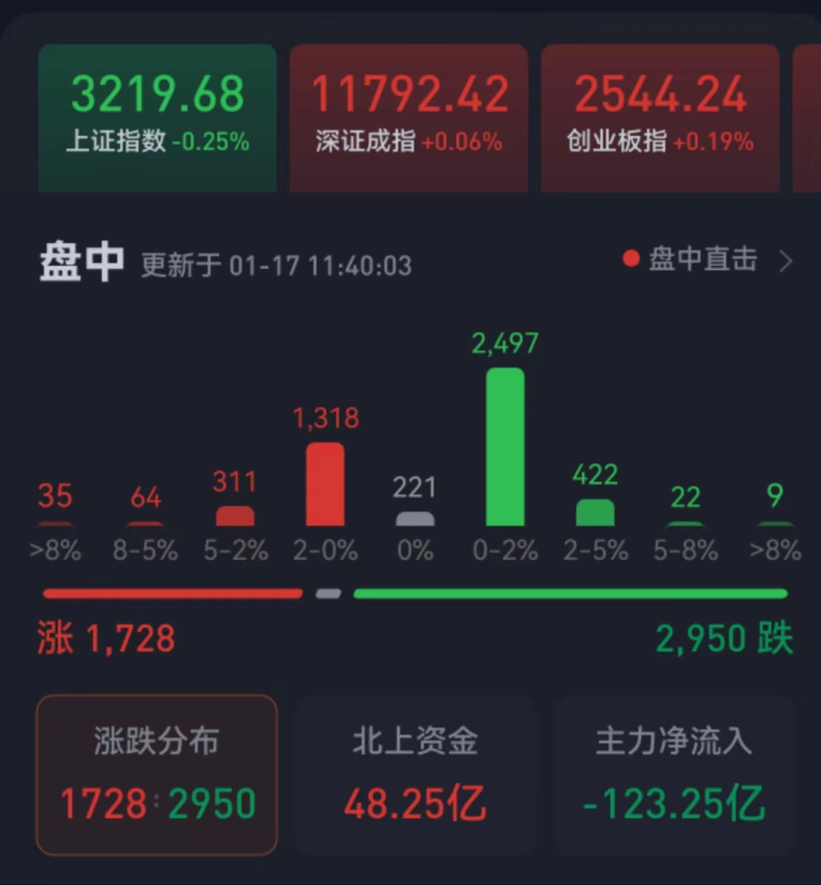 周二(1月17日),三大股指震蕩分化,漲跌不一。截至上午收盤,上證指數(shù)跌幅達0.25%,報3219.68點;深證成指和創(chuàng)業(yè)板指漲幅分別為0.06%和0.19%;滬深兩市合計成交額4458.1億元,總體來看,兩市個股跌多漲少,其中,漲停個股達24只,跌停個股達5只。