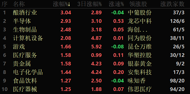 東方財(cái)富行業(yè)方面,截至2月2日11:30,86類行業(yè)中59類上漲,占比68.60%,其中,釀酒行業(yè)漲幅居首,達(dá)3.04%;此外,半導(dǎo)體、生物制品、計(jì)算機(jī)設(shè)備等行業(yè)漲幅也超過2%。下跌方面,教育行業(yè)跌幅居首,達(dá)2.23%;此外,航天航空和多元金融跌幅也均超1%。