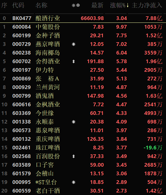 從早盤表現(xiàn)強(qiáng)勢(shì)的釀酒行業(yè)看,交易中的40只成份股有37只上漲,其中,中葡股份封漲停板,另有6只個(gè)股漲超5%。資金流向看,該行業(yè)大單資金凈流入額為7.88億元,居行業(yè)第2位。