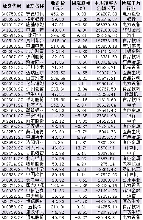 資金方面,周五,北向資金凈賣出金額達42.46億元,停止連續(xù)17個交易日的加倉步伐;其中,滬股通凈賣出43.32億元,深股通凈買入0.86億元。本周北向資金累計凈買入金額達341.79億元。從前十大成交活躍股來看,本周,寧德時代、招商銀行、隆基綠能、中國平安、比亞迪等5只個股,北向資金凈買入金額均超20億元。另外,通威股份、康龍化成等個股遭北向資金凈賣出金額均超7億元。