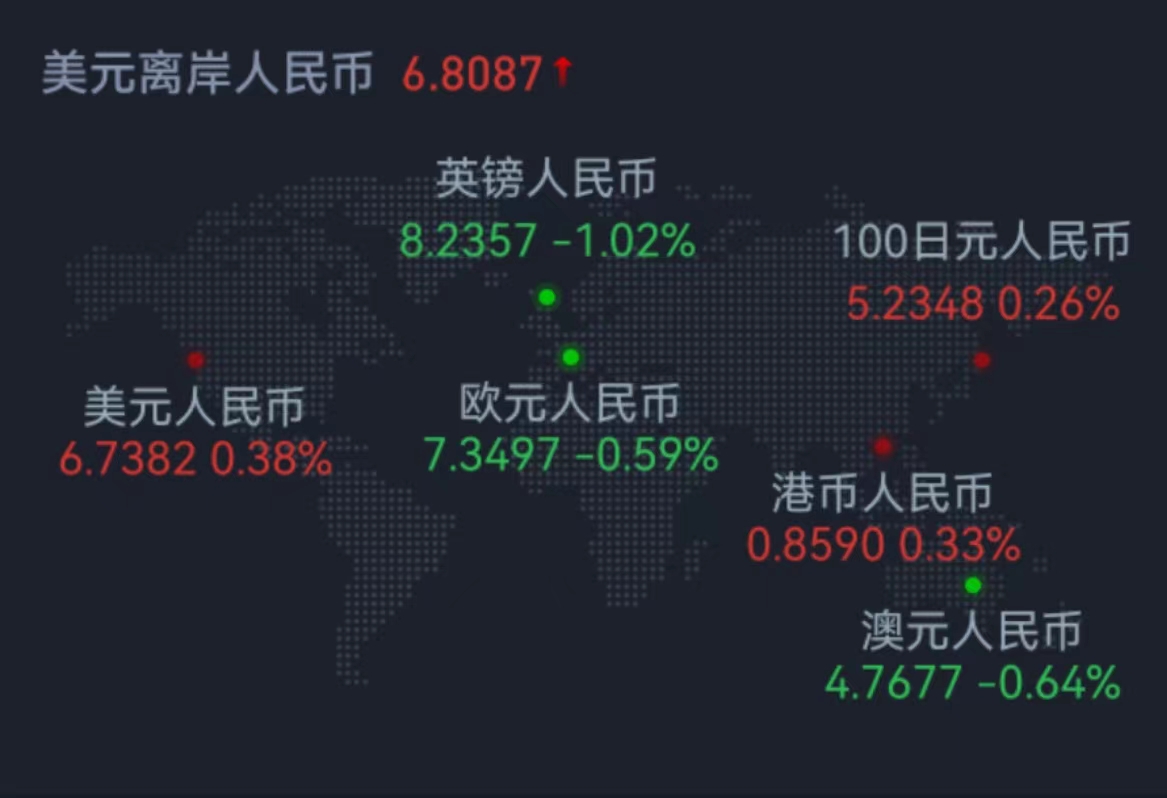 周五在岸人民幣兌美元收盤報6.7465,較上一交易日跌244個基點,本周累漲275個基點。人民幣兌美元中間價報6.7382,調(diào)貶252個基點,本周累計調(diào)升320個基點。在岸人民幣兌美元夜盤收報6.8002。