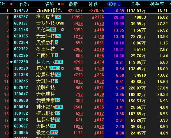 從今天的市場熱點板塊來看,ChatGPT概念板塊大幅飆升達6.99%,位居大智慧板塊的漲幅榜首位。其中,海天瑞聲、云從科技-UW、天娛數科、漢王科技、江南化工等多只概念股集體漲停。