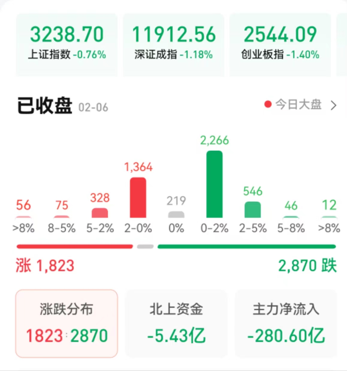 周一(2月6日),A股三大指數震蕩下行。截至收盤,上證指數跌0.76%報3238.7點,深證成指跌1.18%報11912.56點,創(chuàng)業(yè)板指跌1.40%報2544.09點;兩市合計成交額達8747億元,北向資金凈賣出5.43億元,其中,滬股通凈買入13.14億元,深股通凈賣出18.57億元。總體上看,兩市個股跌多漲少。
