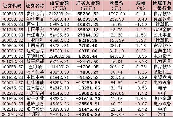 表:今日滬、深股通前十大成交活躍股交易情況: