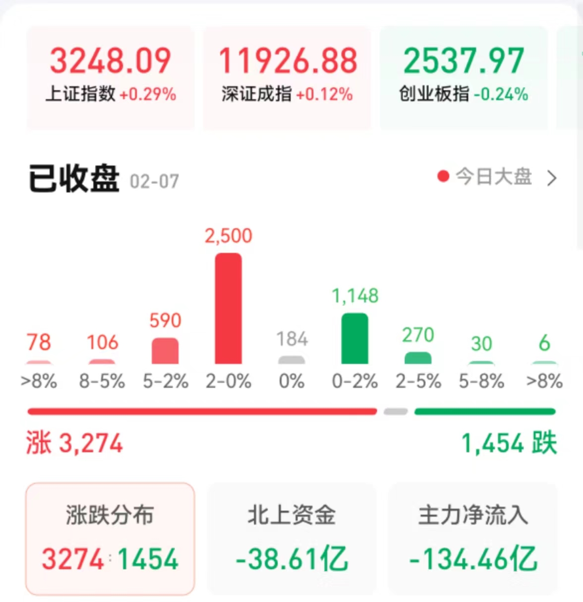 周二(2月7日),A股三大股指震蕩分化,漲跌不一。截至收盤,上證指數(shù)漲0.29%,報(bào)3248.09點(diǎn);深證成指漲0.12%,報(bào)11926.88點(diǎn);創(chuàng)業(yè)板指跌0.24%,報(bào)2537.97點(diǎn)。兩市合計(jì)成交金額達(dá)8457億元,北向資金凈賣出38.61億元??傮w上看,兩市個(gè)股漲多跌少。近3300只個(gè)股實(shí)現(xiàn)上漲,其中,漲停個(gè)股達(dá)48只,跌停個(gè)股達(dá)9只。