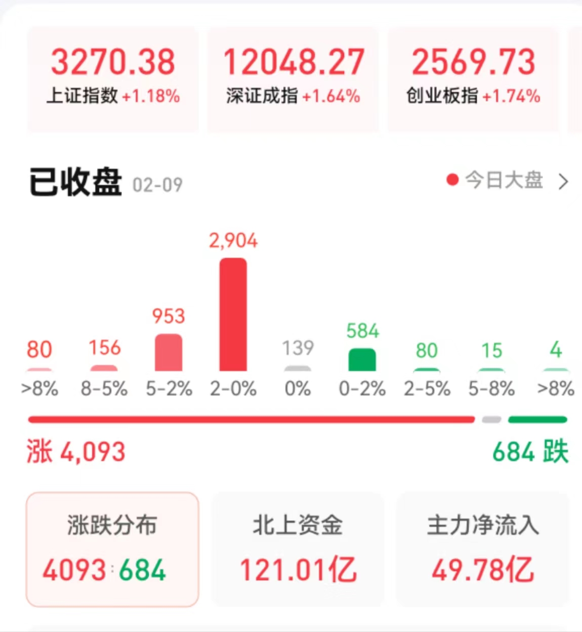 2月9日,A股三大指數(shù)震蕩上行,全線飄紅。截至收盤(pán),上證指數(shù)漲1.18%報(bào)3270.38點(diǎn),深證成指漲1.64%報(bào)12048.27點(diǎn),創(chuàng)業(yè)板指漲1.74%報(bào)2569.73點(diǎn);兩市合計(jì)成交9011億元,北向資金凈買(mǎi)入121.01億元??傮w上看,兩市個(gè)股漲多跌少,超4000只個(gè)股實(shí)現(xiàn)上漲。其中,漲停個(gè)股達(dá)35只,跌停個(gè)股達(dá)9只。