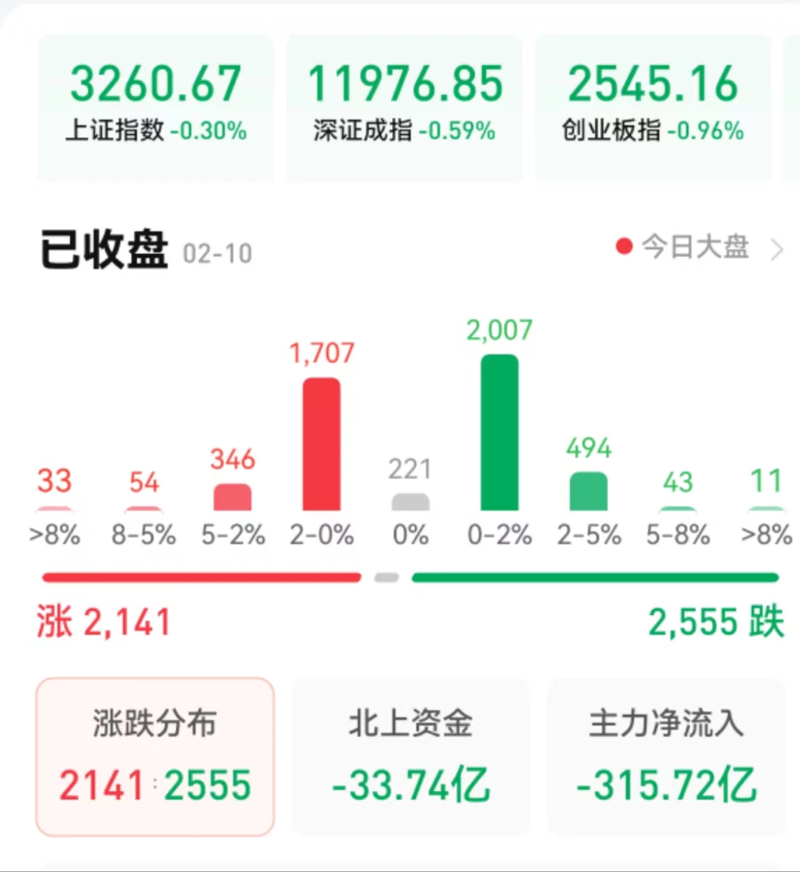 周五(2月10日),A股三大指數(shù)震蕩下行。截至收盤,上證指數(shù)跌0.30%報(bào)3260.67點(diǎn),深證成指跌0.59%報(bào)11976.85點(diǎn),創(chuàng)業(yè)板指跌0.96%報(bào)2545.16點(diǎn);兩市合計(jì)成交8928億元,北向資金凈賣出33.74億元??傮w上看,兩市個(gè)股跌多漲少。其中,漲停個(gè)股達(dá)28只,跌停個(gè)股9只。