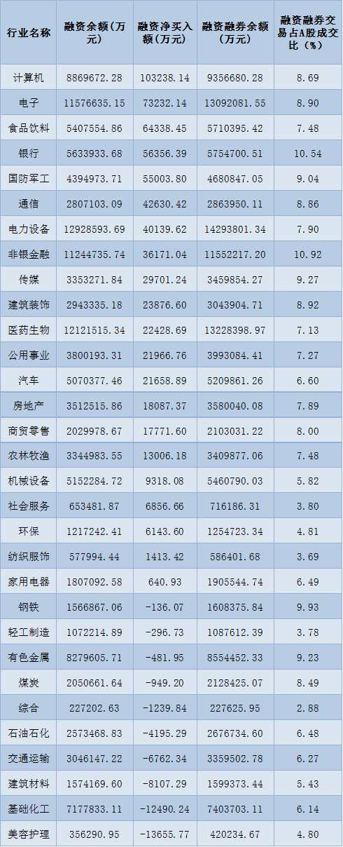 表:2月13日申萬一級(jí)行業(yè)兩融交易情況: