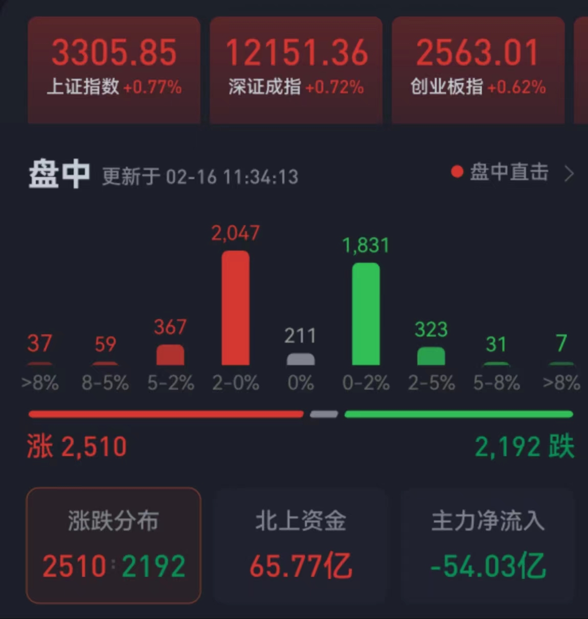 周四(2月16日),三大股指震蕩走高,全線飄紅。截至上午收盤,上證指數(shù)漲0.77%,報(bào)3305.85點(diǎn),突破3300點(diǎn)整數(shù)關(guān)口;深證成指和創(chuàng)業(yè)板指漲幅分別為0.72%和0.62%;滬深兩市合計(jì)成交額5963億元,總體來看,兩市個(gè)股漲多跌少。