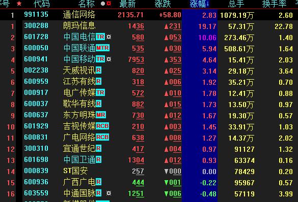 具體看,截至2月16日上午收盤,通信網(wǎng)絡(luò)漲幅居首達(dá)2.83%。其中,朗瑪信息20CM漲停。值得關(guān)注的是,三大通信運(yùn)營商聯(lián)袂走高。中國電信漲停,中國聯(lián)通漲幅達(dá)5.94%,中國移動(dòng)漲幅近5%。