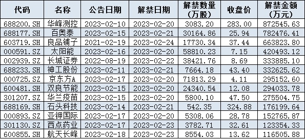 與此同時(shí),統(tǒng)計(jì)顯示,下周(2月20日-24日)共有56家公司限售股陸續(xù)解禁,按最新收盤價(jià)計(jì)算,解禁市值為559.14億元。從解禁市值來看,華峰測(cè)控(87.25億元)、百奧泰(78.25億元)、良品鋪?zhàn)樱?6.38億元)等公司解禁金額均超60億元,位居前三位。解禁股數(shù)居前三位的是京東方A(7.18億股)、太陽(yáng)能(5.88億股)、長(zhǎng)城證券(3.84億股)。