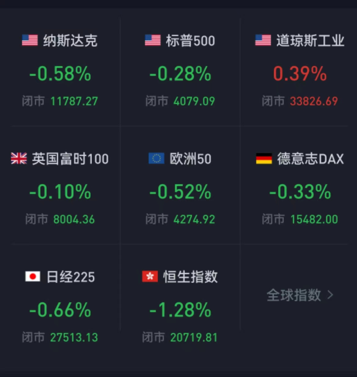 周五,美國(guó)三大股指收盤漲跌不一,道指漲0.39%報(bào)33826.69點(diǎn),標(biāo)普500指數(shù)跌0.28%報(bào)4079.09點(diǎn),納指跌0.58%報(bào)11787.27點(diǎn)。本周,道指跌0.13%,標(biāo)普500指數(shù)跌0.28%,納指漲0.59%。