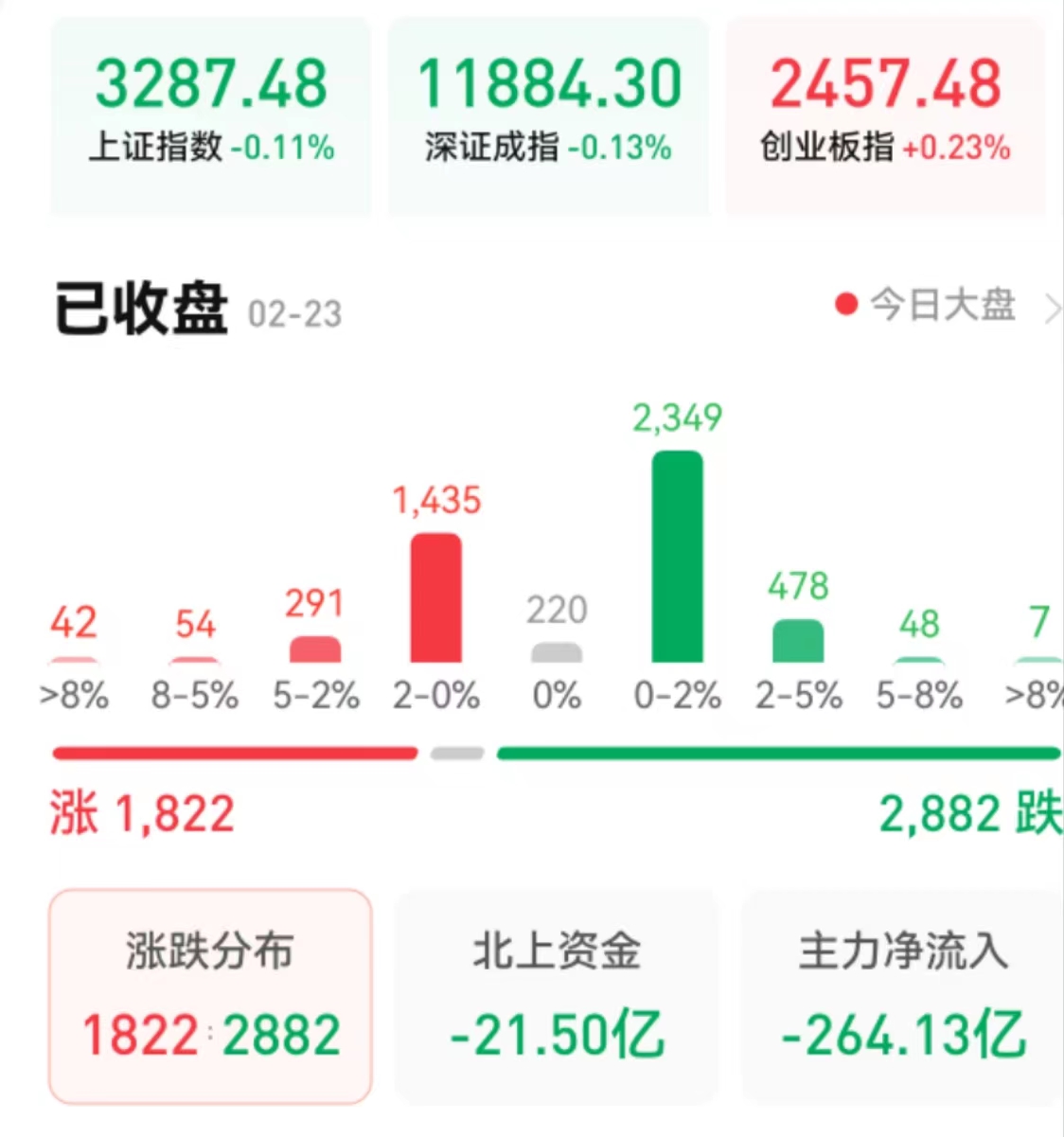 周四(2月23日),A股三大指數(shù)繼續(xù)震蕩分化。截至收盤(pán),上證指數(shù)跌0.11%報(bào)3287.48點(diǎn),深證成指跌0.13%報(bào)11884.3點(diǎn),創(chuàng)業(yè)板指漲0.23%報(bào)2457.48點(diǎn);兩市合計(jì)成交8073億元,北向資金凈賣(mài)出21.5億元??傮w上看,兩市個(gè)股跌多漲少。