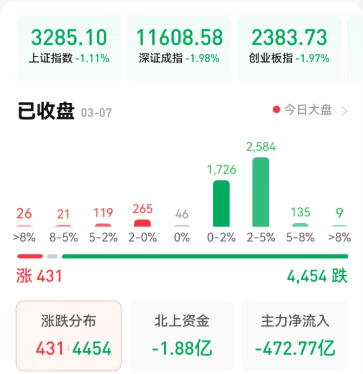 周二(3月7日),A股三大指數(shù)震蕩回落,跌幅均超1%。截至收盤,上證指數(shù)跌1.11%,報3285.1點;深證成指跌1.98%,報11608.58點;創(chuàng)業(yè)板指跌1.97%,報2383.73點。兩市合計成交金額達9327億元;北向資金凈賣出1.88億元??傮w上看,兩市個股跌多漲少,超4400只個股出現(xiàn)下跌。
