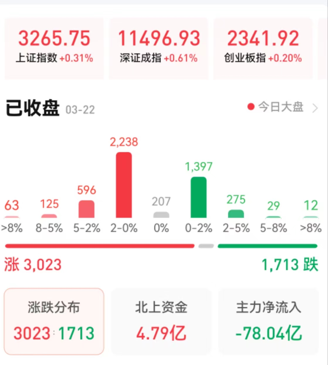 周三(3月22日),A股三大股指震蕩上行,全線飄紅。截至收盤,上證指數(shù)漲0.31%報3265.75點(diǎn),深證成指漲0.61%報11496.93點(diǎn),創(chuàng)業(yè)板指漲0.20%報2341.92點(diǎn);兩市合計成交金額9578億元。總體上看,兩市個股漲多跌少。其中,漲停個股達(dá)34只,跌停個股達(dá)5只。
