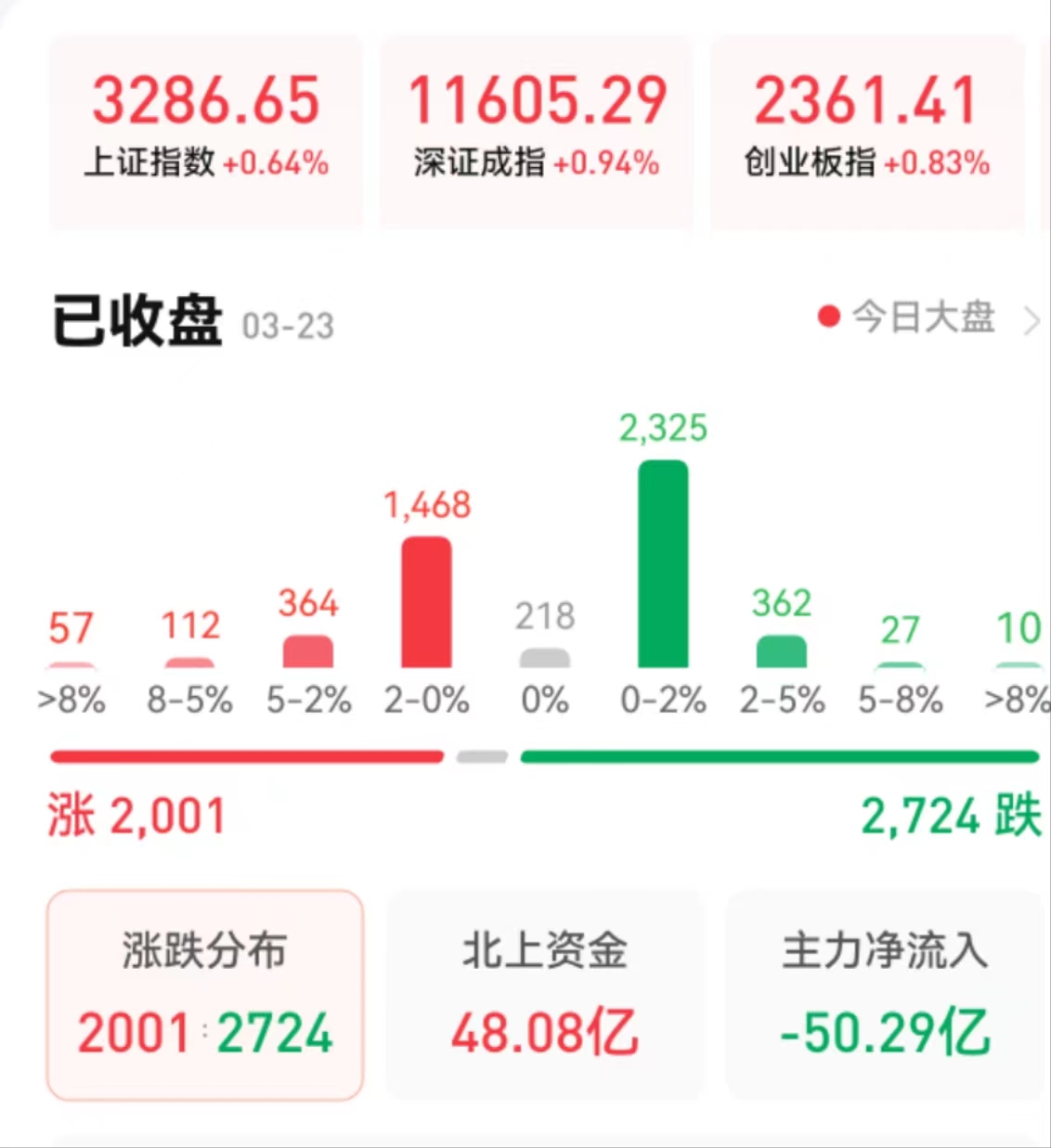 周四(3月23日),A股三大指數(shù)震蕩上行,全線飄紅。截至收盤,上證指數(shù)漲0.64%報(bào)3286.65點(diǎn),深證成指漲0.94%報(bào)11605.29點(diǎn),創(chuàng)業(yè)板指漲0.83%報(bào)2361.41點(diǎn);兩市合計(jì)成交金額達(dá)10207億元??傮w上看,兩市個(gè)股跌多漲少。其中,漲停個(gè)股達(dá)27只,跌停個(gè)股達(dá)5只。