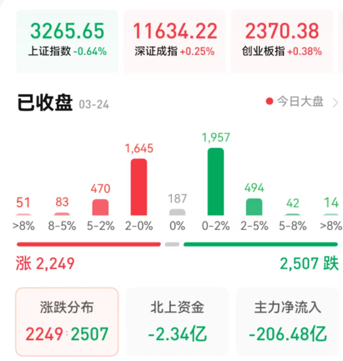 周五(3月24日),A股三大指數(shù)震蕩分化,漲跌不一。截至收盤,上證指數(shù)跌0.64%報(bào)3265.65點(diǎn),深證成指漲0.25%報(bào)11634.22點(diǎn),創(chuàng)業(yè)板指漲0.38%報(bào)2370.38點(diǎn);兩市合計(jì)成交金額達(dá)10748億元,連續(xù)第2個(gè)交易日成交額突破萬(wàn)億元,北向資金凈賣出2.34億元??傮w上看,兩市個(gè)股跌多漲少。其中,漲停個(gè)股達(dá)30只,跌停個(gè)股達(dá)6只。