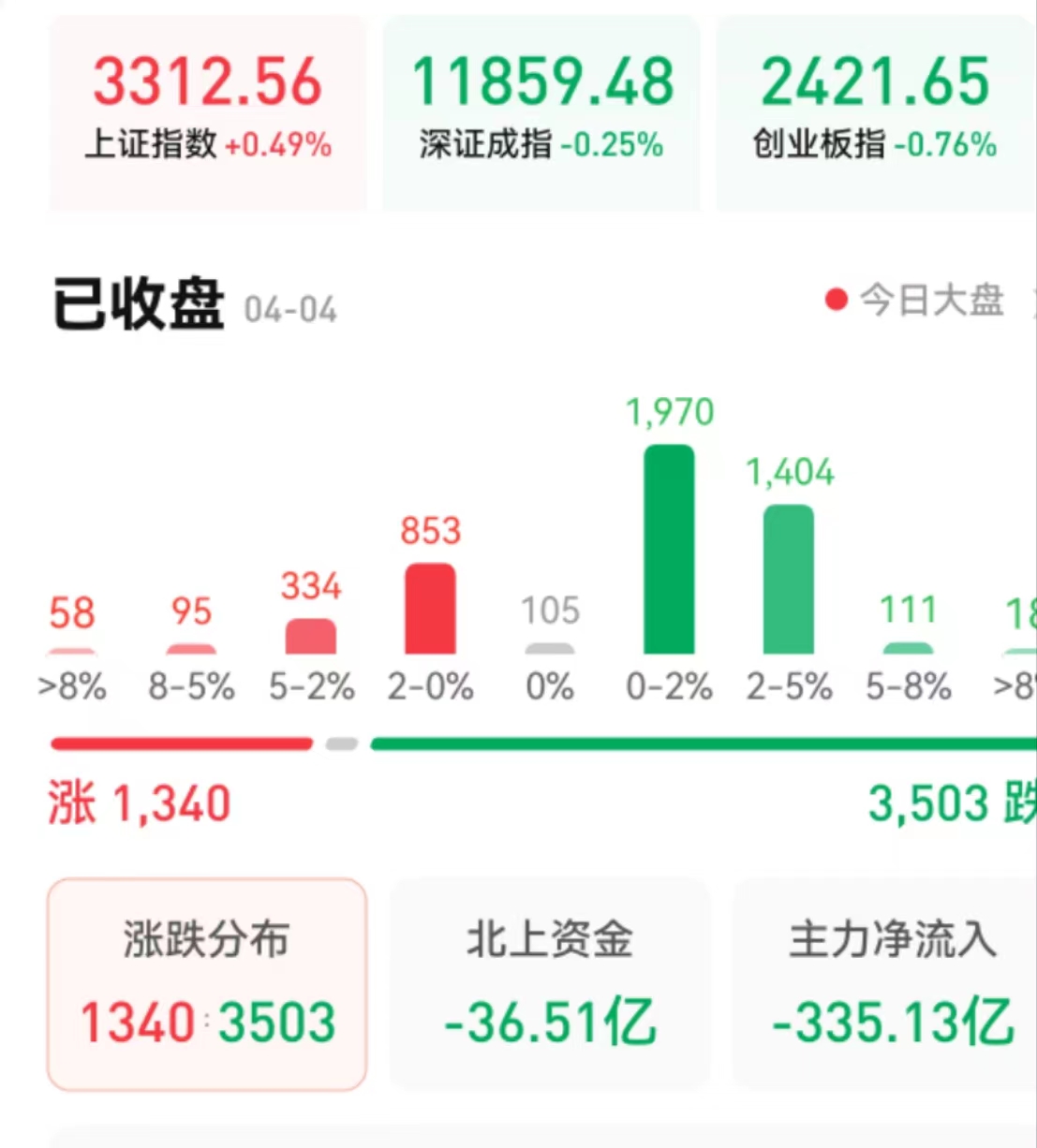 周二(4月4日),A股三大股指震蕩分化。截至收盤,上證指數(shù)漲0.49%,報3312.56點;深證成指跌0.25%,報11859.48點;創(chuàng)業(yè)板指跌0.76%,報2421.65點。兩市合計成交額13246億元,連續(xù)第2個交易日突破萬億元;北向資金凈賣出36.51億元;總體來看,A股個股跌多漲少,其中,漲停個股達(dá)26只,跌停個股達(dá)8只。