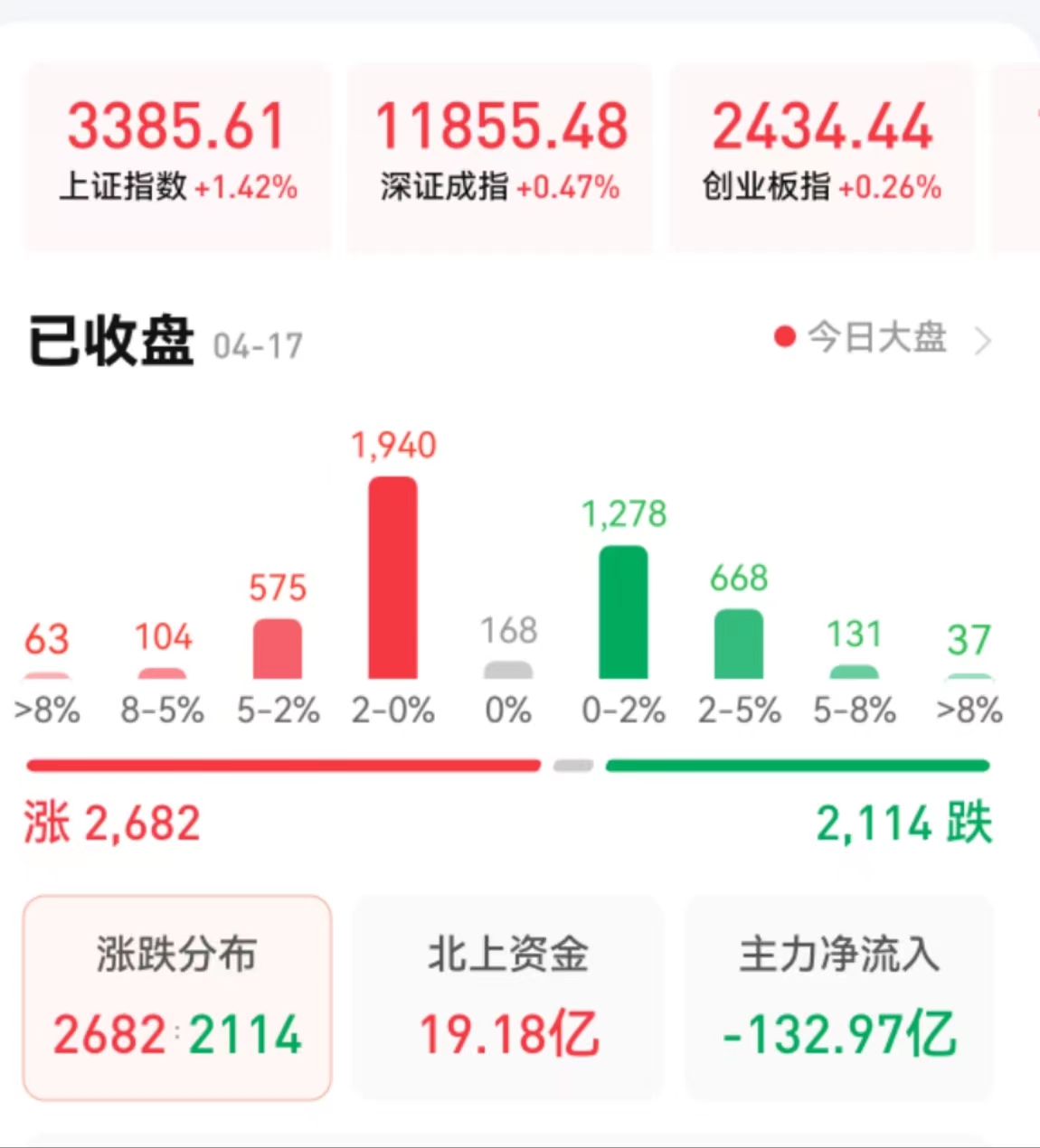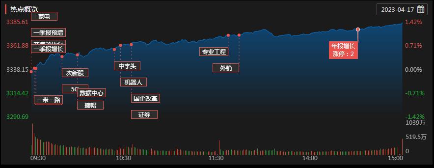 周一(4月17日),A股三大股指震蕩上行,全線飄紅。截至收盤,上證指數(shù)漲1.42%報(bào)3385.61點(diǎn),創(chuàng)出年內(nèi)新高;深證成指漲0.47%報(bào)11855.48點(diǎn),創(chuàng)業(yè)板指漲0.26%報(bào)2434.44點(diǎn),兩市合計(jì)成交11208.43億元,連續(xù)第10個(gè)交易日突破萬億元;北向資金凈買入19.18億元??傮w上看,兩市個(gè)股漲多跌少。其中,漲停個(gè)股達(dá)38只,跌停個(gè)股達(dá)20只。