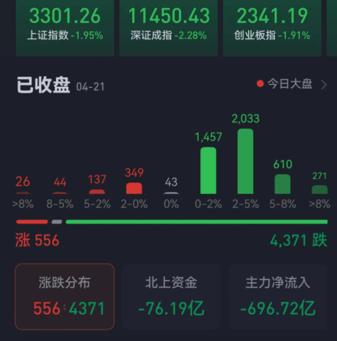 周五(4月21日),A股三大指數(shù)集體收跌超1%。截至收盤,上證指數(shù)跌1.95%報3301.26點(diǎn),深證成指跌2.28%報11450.43點(diǎn),創(chuàng)業(yè)板指跌1.91%報2341.19點(diǎn),科創(chuàng)50指數(shù)跌4.13%;兩市合計成交12178.68億元,連續(xù)第14個交易日突破萬億元,北向資金凈賣出76.19億元,本周北向資金累計凈流入3.38億元??傮w上看,兩市個股跌多漲少。其中,漲停個股達(dá)12只,跌停個股達(dá)44只。