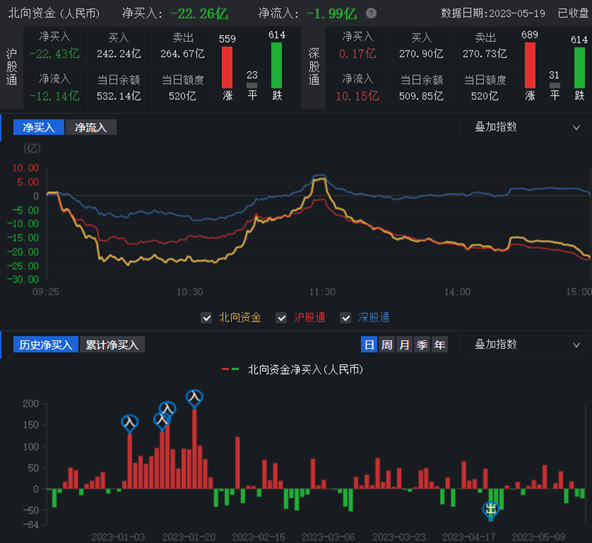 5月19日,A股三大指數(shù)集體低開,個股活躍,深證成指和創(chuàng)業(yè)板指表現(xiàn)強勢,滬指早盤翻紅后午盤未能保持強勢。截至收盤,上證指數(shù)跌0.42%報3283.54點;深證成指漲0.12%報11091.36點,創(chuàng)業(yè)板指漲0.03%報2278.59點,A股合計成交額8498.62億元,較前一交易日縮減3.67%;北向資金全天凈賣出22.26億元;其中滬股通凈買入-22.43億元,深股通凈買入0.17億元。今日A股上漲股略多,有2510只上漲,2479只下跌。