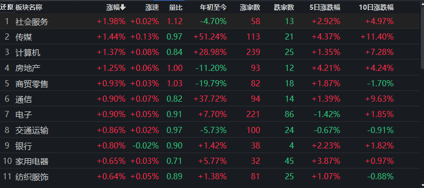 6月7日,從31類申萬一級行業(yè)看,有17類行業(yè)上漲,社會服務(wù)行業(yè)漲幅居首,達(dá)1.98%。漲幅居前三位的行業(yè)分別為社會服務(wù)(1.98%)、傳媒(1.44%)、計算機(jī)(1.37%)。下跌方面,電力設(shè)備居首,跌幅達(dá)2.23%,行業(yè)內(nèi)209只個股下跌,占比近八成。其中,社會服務(wù)行業(yè)中旅游及景區(qū)、酒店餐飲等兩類申萬二級行業(yè)個股表現(xiàn)活躍,九華旅游、三特索道、西安飲食均漲停。