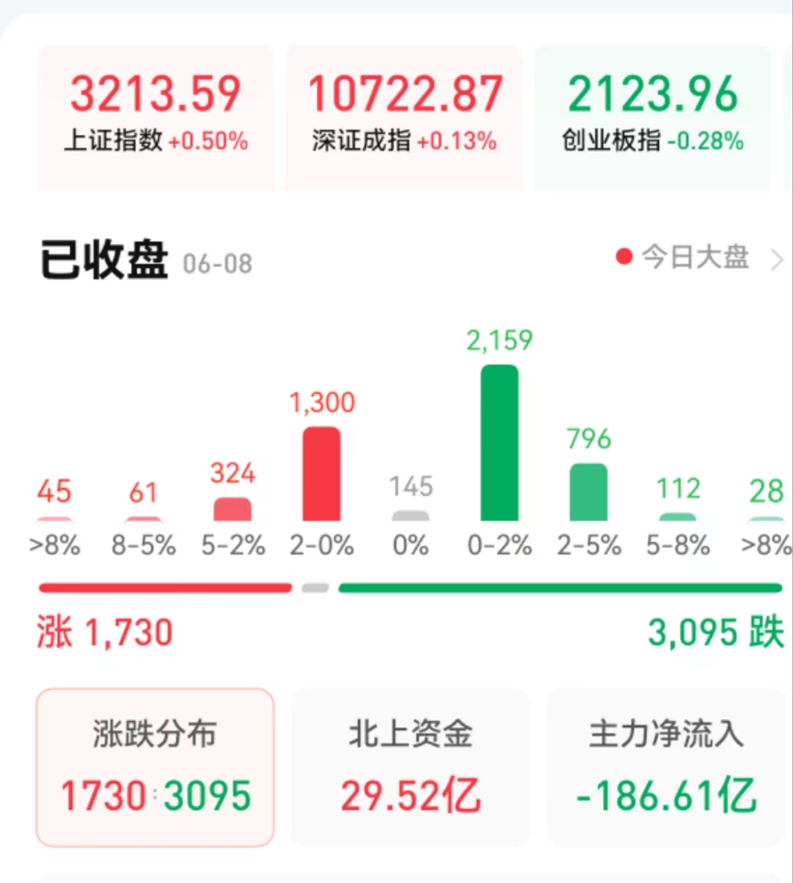 周四(6月8日),A股三大股指震蕩整理,漲跌不一。截至收盤,上證指數(shù)漲0.5%報(bào)3213.59點(diǎn),深證成指漲0.13%報(bào)10722.87點(diǎn),創(chuàng)業(yè)板指跌0.28%報(bào)2123.96點(diǎn);兩市合計(jì)成交8596億元,北向資金凈買入29.52億元??傮w上看,兩市個(gè)股跌多漲少。其中,漲停個(gè)股達(dá)39只,跌停個(gè)股達(dá)18只。