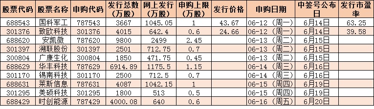 根據(jù)發(fā)行安排,下周(6月12日-16日)有10只新股發(fā)行,包括5只科創(chuàng)板新股、5只創(chuàng)業(yè)板新股。